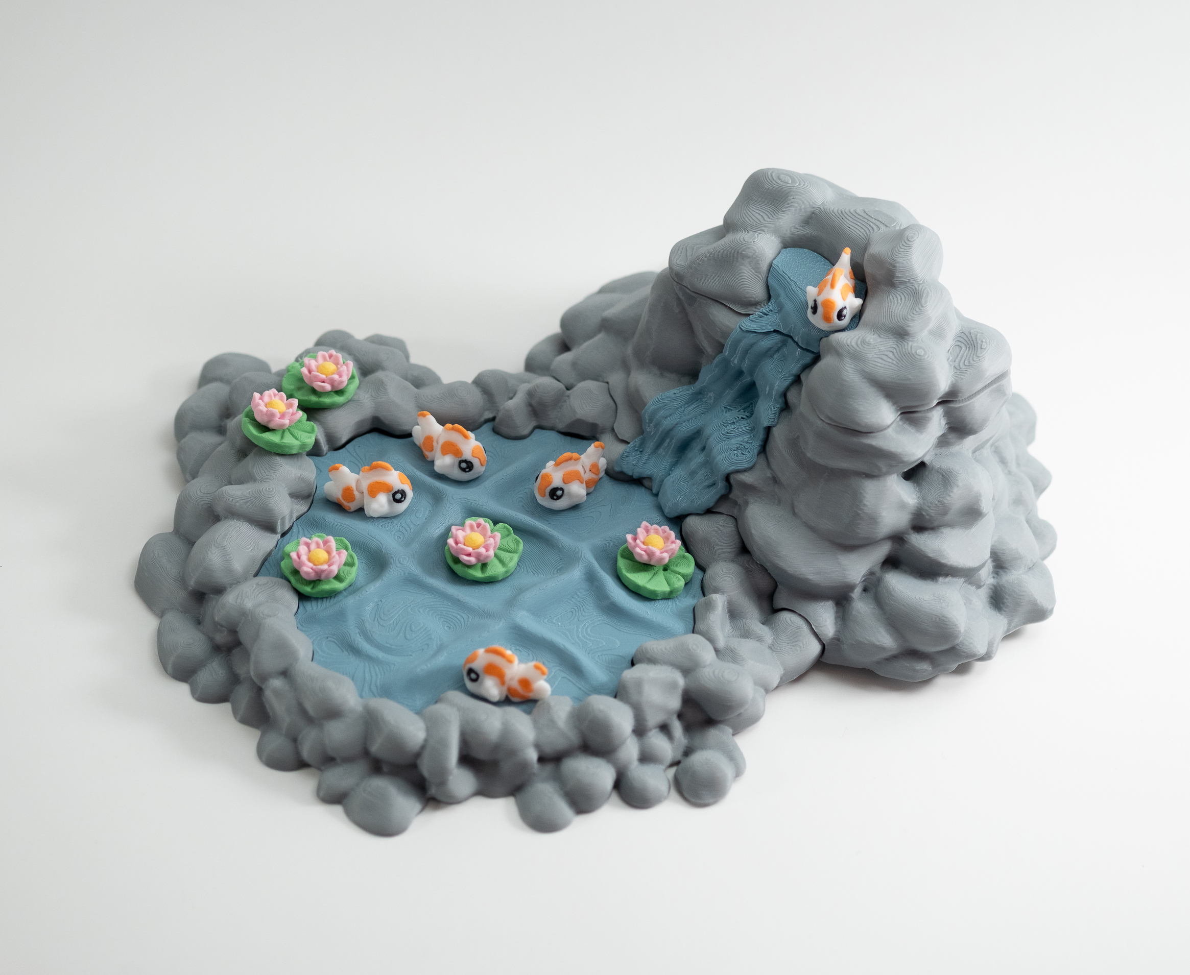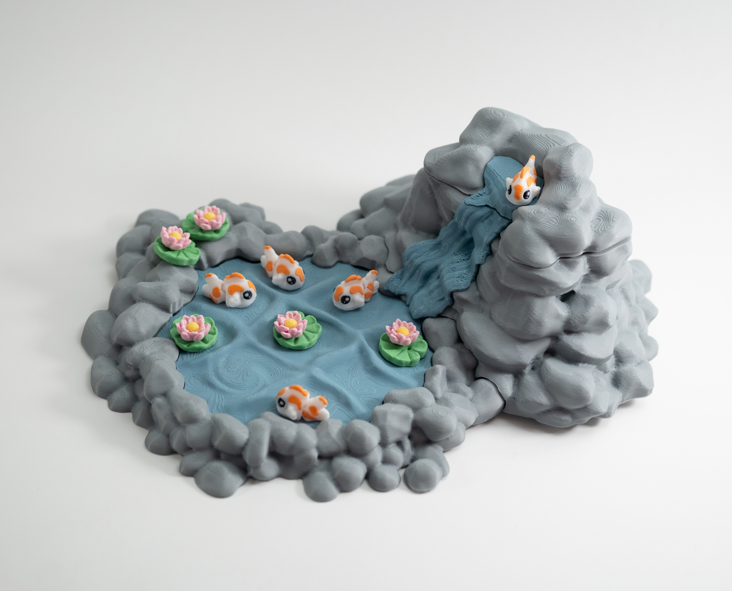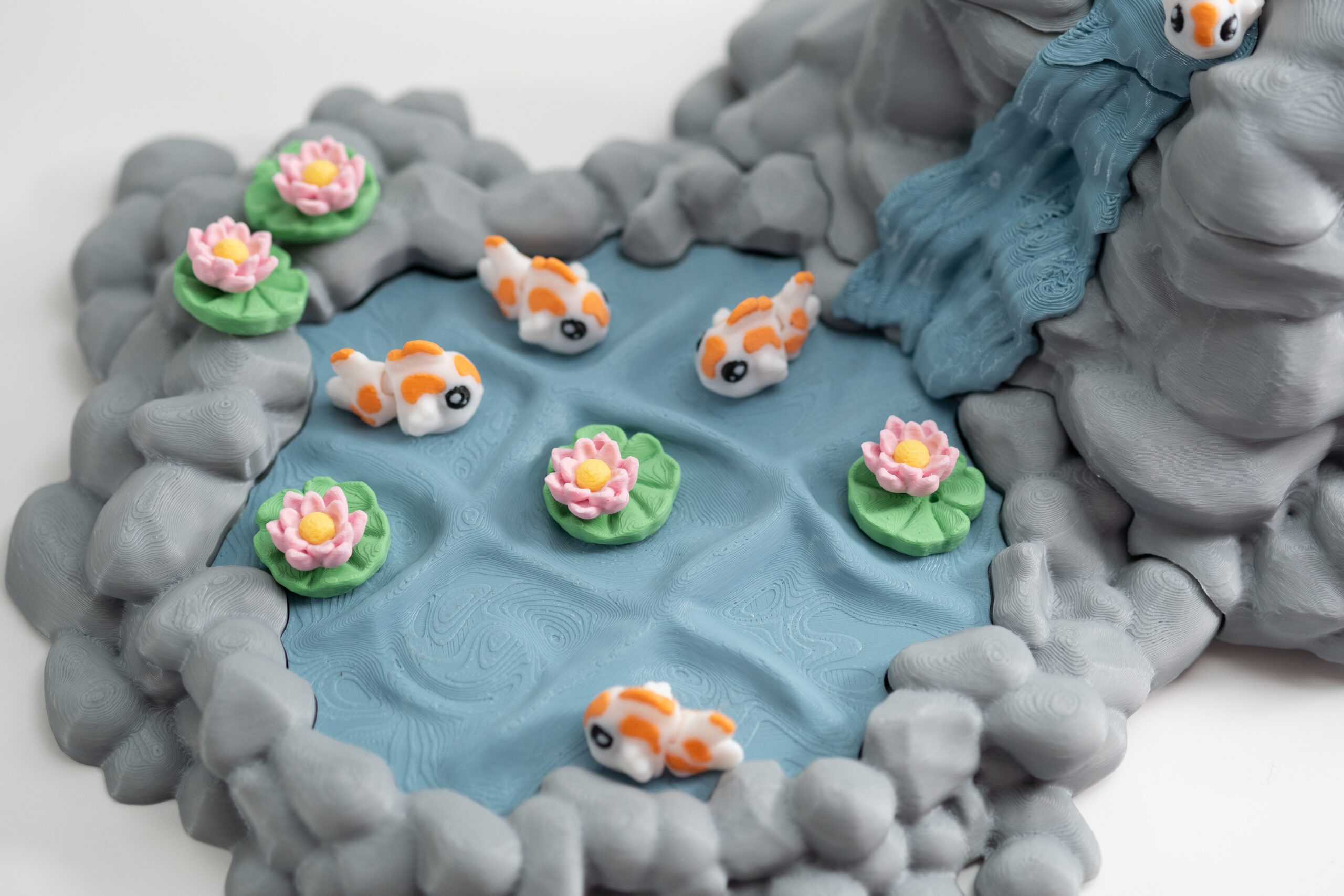 Bring serenity to game night with our beautifully crafted Waterfall Koi Pond Tic Tac Toe Set. This peaceful, 3D-printed scene doubles as an interactive game and a stunning desk or shelf display. The game pieces—adorable koi fish and blooming lily pads—glide across a sculpted pond nestled in rocks, with a flowing waterfall to complete the tranquil atmosphere.