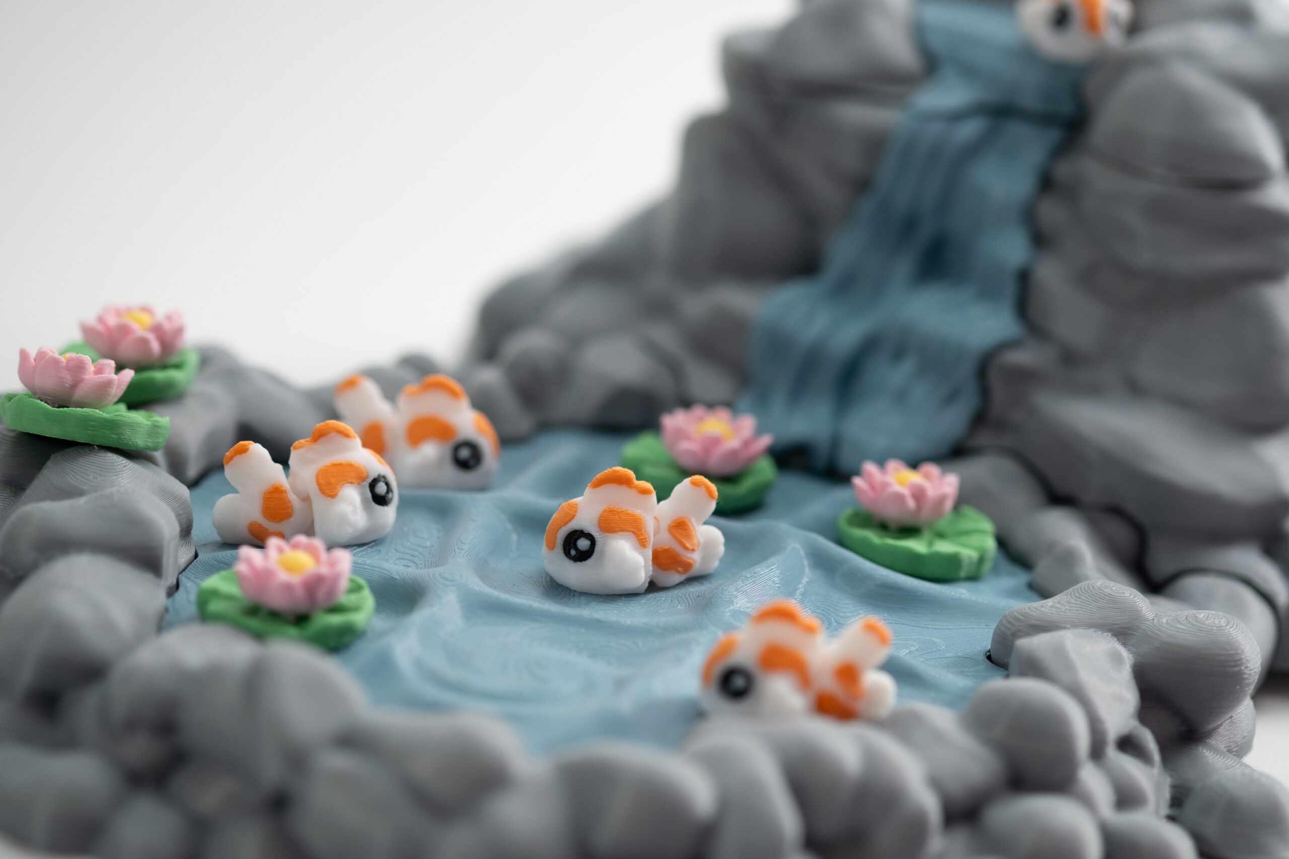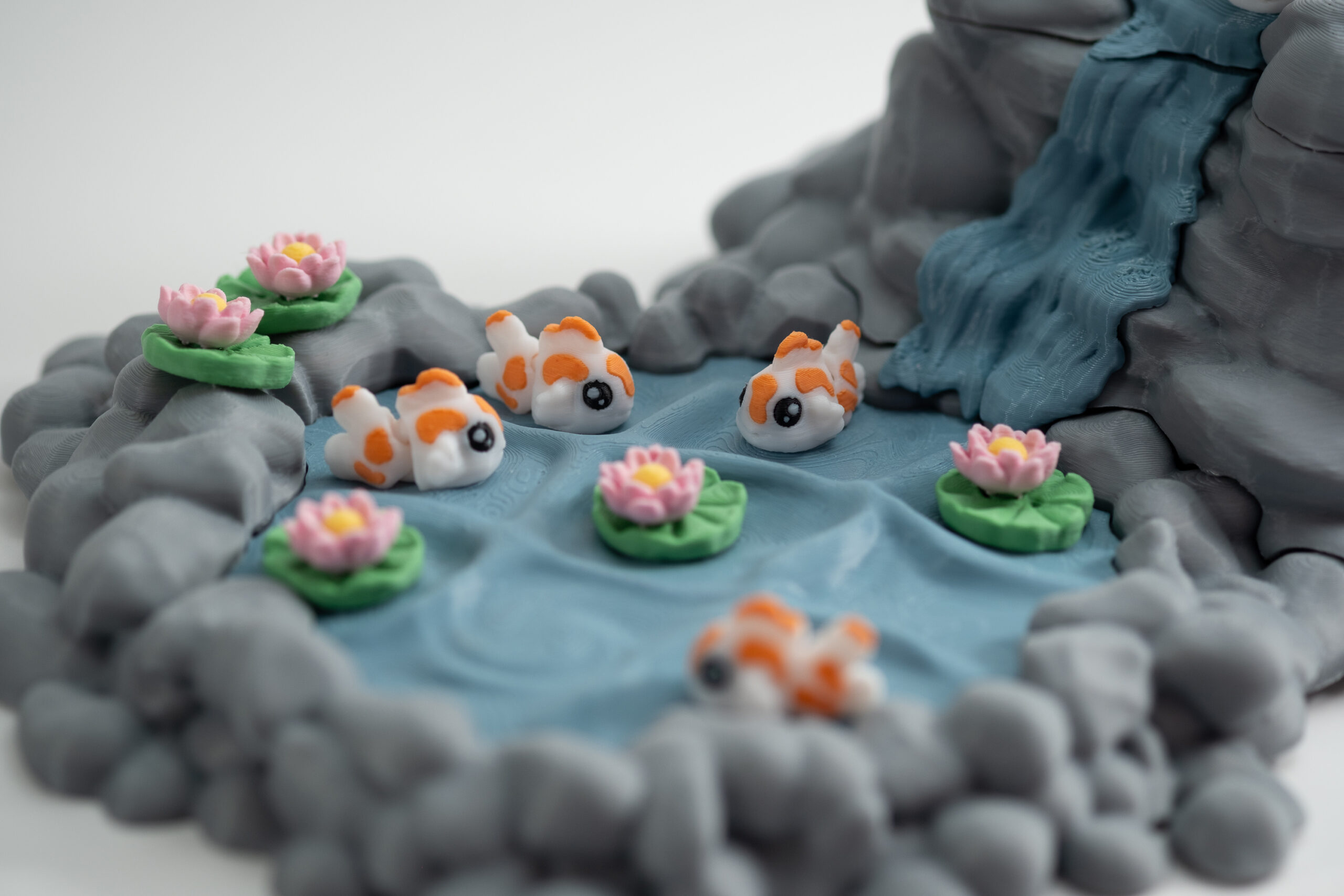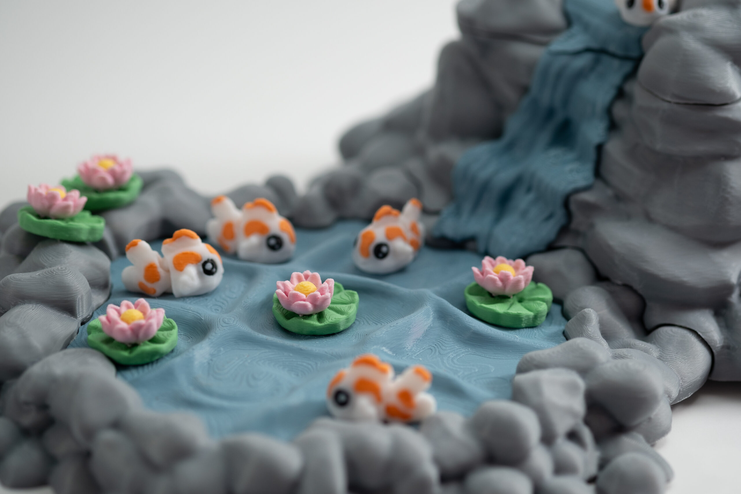 Bring serenity to game night with our beautifully crafted Waterfall Koi Pond Tic Tac Toe Set. This peaceful, 3D-printed scene doubles as an interactive game and a stunning desk or shelf display. The game pieces—adorable koi fish and blooming lily pads—glide across a sculpted pond nestled in rocks, with a flowing waterfall to complete the tranquil atmosphere.